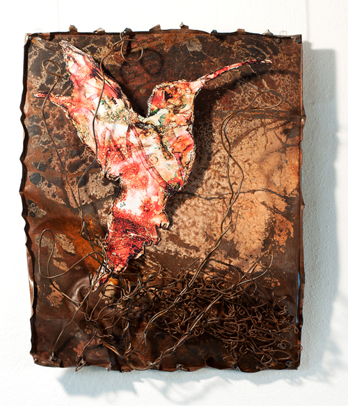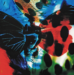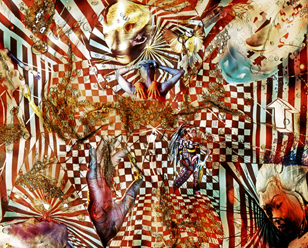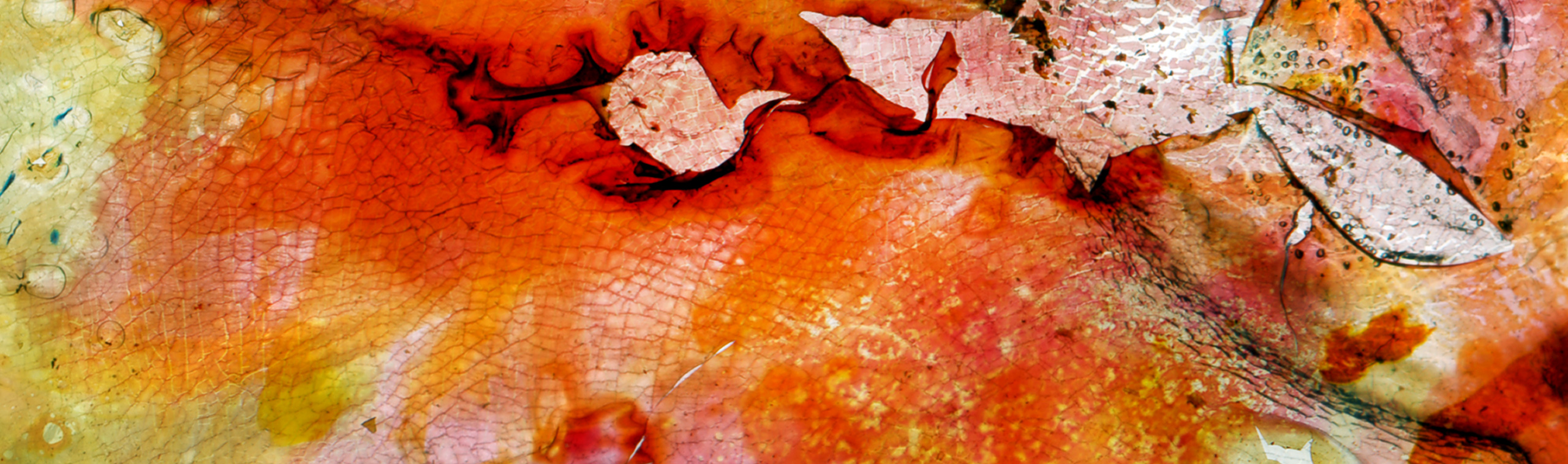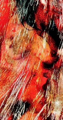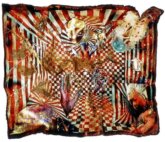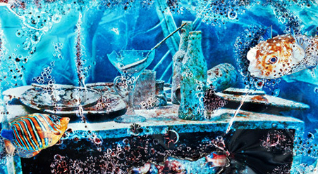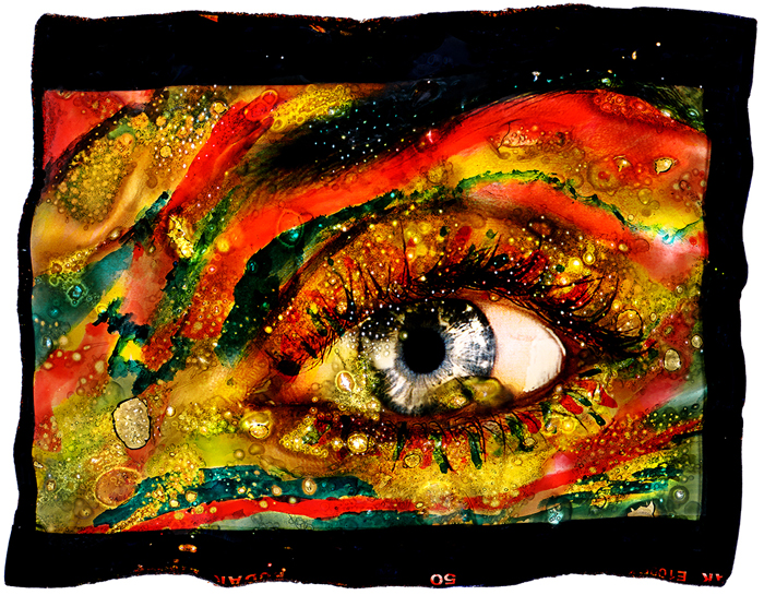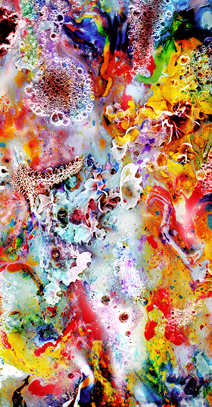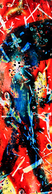 rungen und Farbverschmelzungen, die vom Künstler wirkungsvoll eingearbeitet werden. Die so auf Fotopapier entstandene Vorlage wird vergrößert, noch einmal bearbeitet und schließlich mit Klebstoffen auf Holz oder Metall kaschiert.