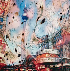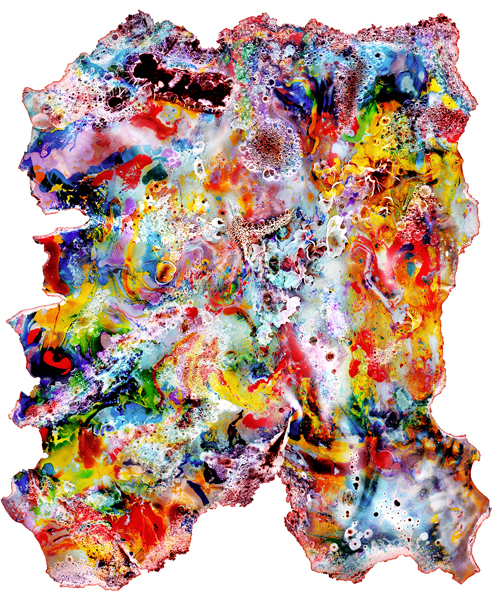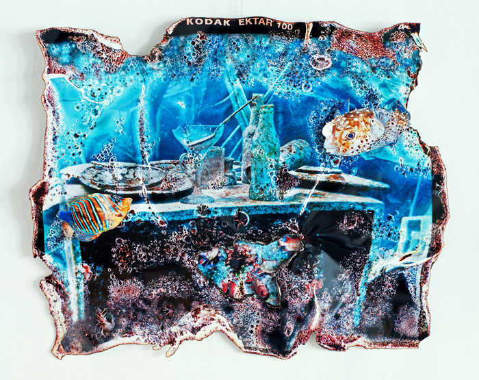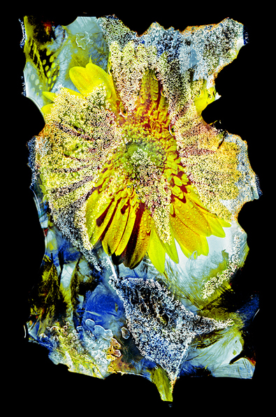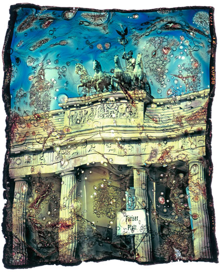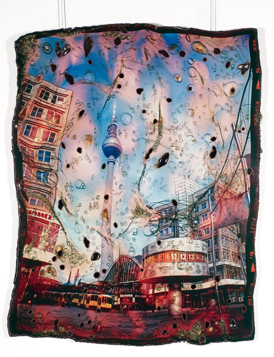 Es ist ein ziemlich aufwendiges, mühsames und riskantes Verfahren, in dem der Berliner Foto Künstler seine farbenfrohen, leuchtenden Arbeiten herstellt. Das Ergebnis sind große Werke, die einem Gemälde ähneln. Da sie aber auf massiven Holztafeln, auf Aluminiumplatten oder auf dicken Metallblöcken aufgeschweißt sind, treten sie dem Betrachter eher dreidimensional gegenüber und nehmen plastische Gestalt an.